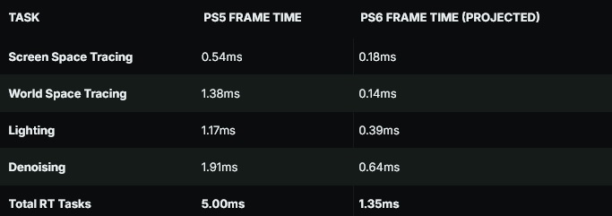 Въпреки че липсват данни за производителността на останалите елементи в кадъра, източникът отбелязва, че базовата версия на PS5 осигурява стабилни 30 FPS в RT режима на играта, което позволява да се направи приблизителна оценка от около 25 ms за останалото, което би съответствало на около 8.33 ms на PlayStation 6. По този начин, ако пренебрегнем ограничението на честотата на кадрите, общото време на кадър на PS5 би било около 30 ms (~33.33 средни FPS) и 9.68 ms (~103.3 средни FPS) на PS6, което прави 10-кратното увеличение на производителността при RT 3.10-кратно увеличение на действителните честоти на кадрите, тъй като няма много проследяване на лъчи.