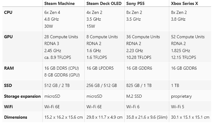 Отдавна изчезналата настолна гейм система Steam Machine на Valve най-накрая се завърна под формата на нова Steam Machine. Подобно на Steam Deck, тя използва специално разработен AMD чип с шест Zen 4 ядра и 28 CU GPU (110 W TDP), който е олекотена версия на Radeon RX 7600. Макар да не е посочено изрично, списъкът в Geekbench потвърждава последното.