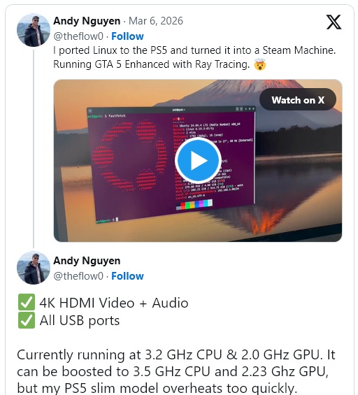 Софтуерният ентусиаст Анди Нгуен, известен в интернет като theflow0, успя да портне Linux на конзолата PlayStation 5 на Sony. Той дори успя да инсталира GTA V на системата и да я стартира при 1440p/60 FPS с активирано проследяване на лъчи, доказвайки пълната функционалност на конзолата под Linux.