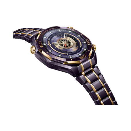 Новият HUAWEI WATCH ULTIMATE DESIGN Royal Gold Edition задава нов стандарт в дизайна на смартчасовници от висок клас със своите първокласни материали и изключителна изработка. Безелът е изработен от първата в индустрията редкоземна лилава керамика, кована при 1400°C, за да се постигне уникалния му лилав оттенък. Шест сегмента от 18-каратово злато са ръчно инкрустирани в рамката с прецизност, за да създадат елегантна хармония от лилаво и злато. Корпусът е изработен от аморфен метал на циркониева основа. Всичко това, съчетано с прецизно фрезоване и множество процеси на полиране, осигурява издръжливост, устойчивост на корозия и превъзходно тактилно усещане.