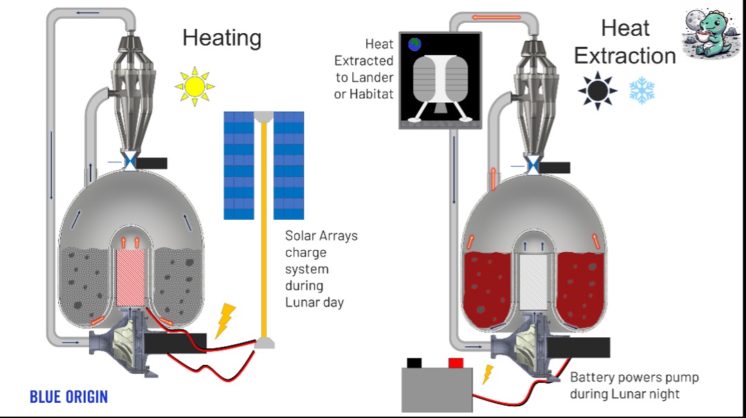 „TEAREX взема лунен реголит или лунен прах от повърхността на Луната, циркулира го през тази камера и след това извлича топлината чрез лек топлообменник“, обясни вицепрезидентът по технологии на Blue Origin Уилям Бренан по време на събитието, докато държеше елегантно устройство с размер около 30 см. „След това го прекарва през този цилиндър, за да предпази останалата част от машината от чувствителните и абразивни скали.“