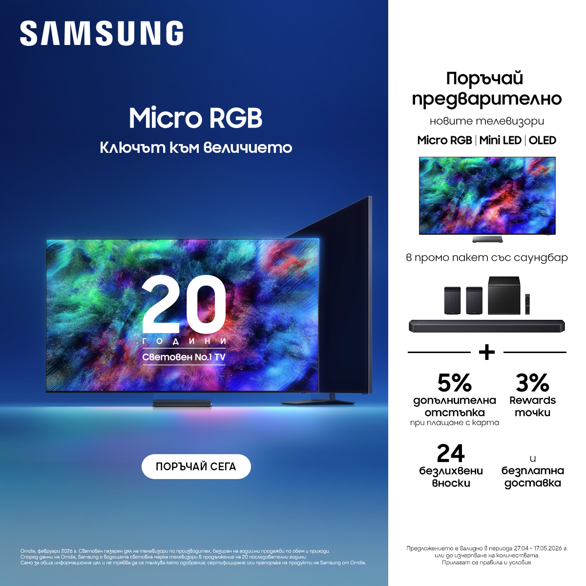 Samsung България стартира предварителните поръчки за новото поколение AI телевизори Micro RGB, Mini LED и OLED. Кампанията се провежда в периода 27 април – 17 май 2026 г. и дава възможност на потребителите да бъдат сред първите, които ще се докоснат до бъдещето на домашното забавление.