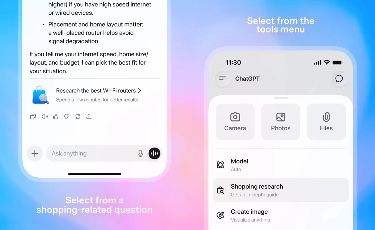 Потребителите могат също така ръчно да изберете „проучване за пазаруване“ от менюто (+), за да накарате ChatGPT да ви съдейства.