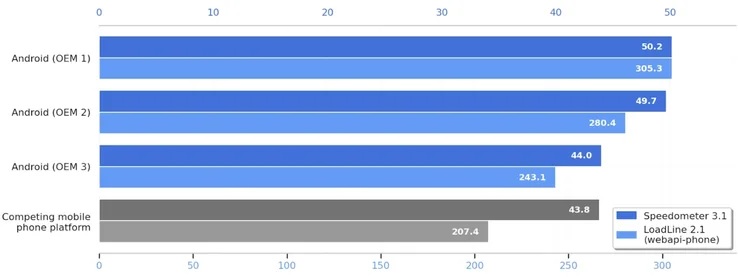 Speedometer е съвместен проект на Apple, Google и Mozilla, който симулира обичайни потребителски задачи като кликване върху бутони за сърфиране и превъртане, за да измери колко „отзивчив“ се усеща браузърът. Резултатите от бенчмарка, споделени от Google, показват, че неназовани флагмански телефони с Android изпреварват по резултати най-новите телефони от „конкурентна мобилна платформа“ (т.е. iOS).