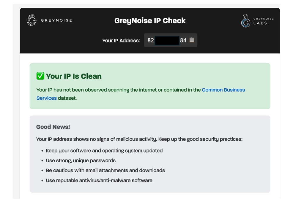 Добрата новина е, че вече можете да проверите дали вашият IP адрес е в списъка с нежелани адреси. С новата функция IP Check на GreyNoise ще разберете дали този IP адрес е бил засечен да сканира интернет или се появява в нашата база данни с известни бизнес услуги.