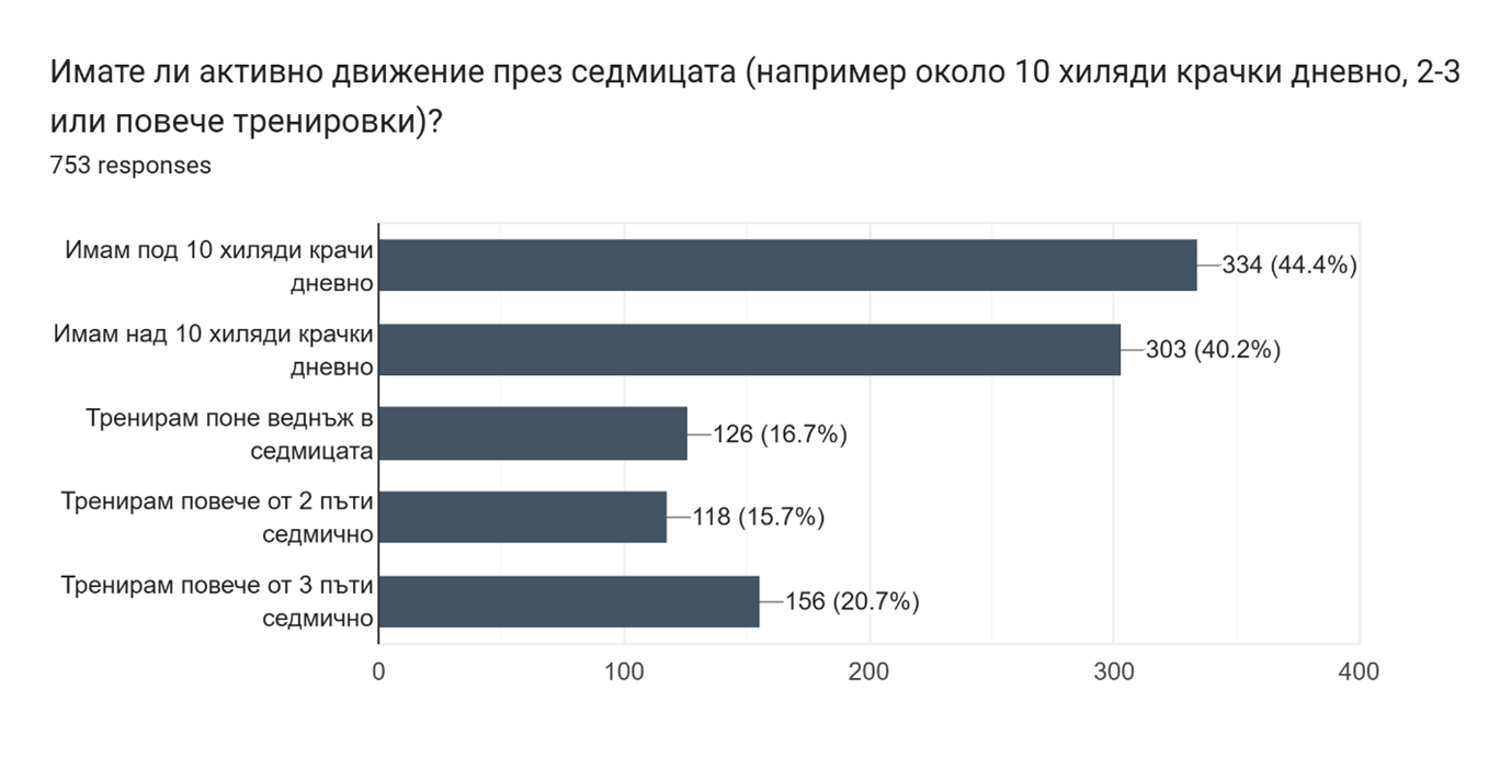 Българите демонстрират стремеж към по-здравословен живот, но реалността показва, че активността им остава по-ниска от препоръчителното. Това разкрива онлайн анкета на Huawei, проведена в рамките на инициативата „21 дни спортно предизвикателство с HUAWEI“. На зададените в рамките на кампанията 17 въпроса са отговорили 752 души, а данните очертават отчетлив контраст между намерения и ежедневни навици. Почти 60% (58.6%) от анкетираните вярват, че се хранят здравословно, но 44.4% правят под 10 000 крачки на ден, а повече от половината не спортуват редовно.