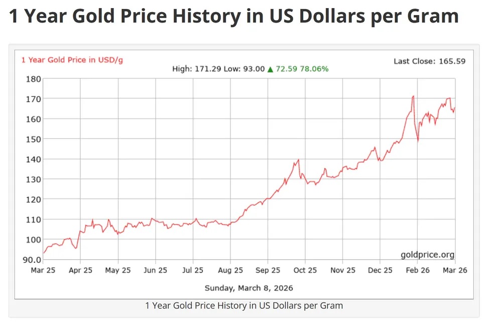 Преминавайки към сериозния въпрос за оценката на златото, графиката по-долу показва, че цената на златото (Au) е скочила от около 108 долара за грам през август 2025 г. до 166 долара за грам днес.