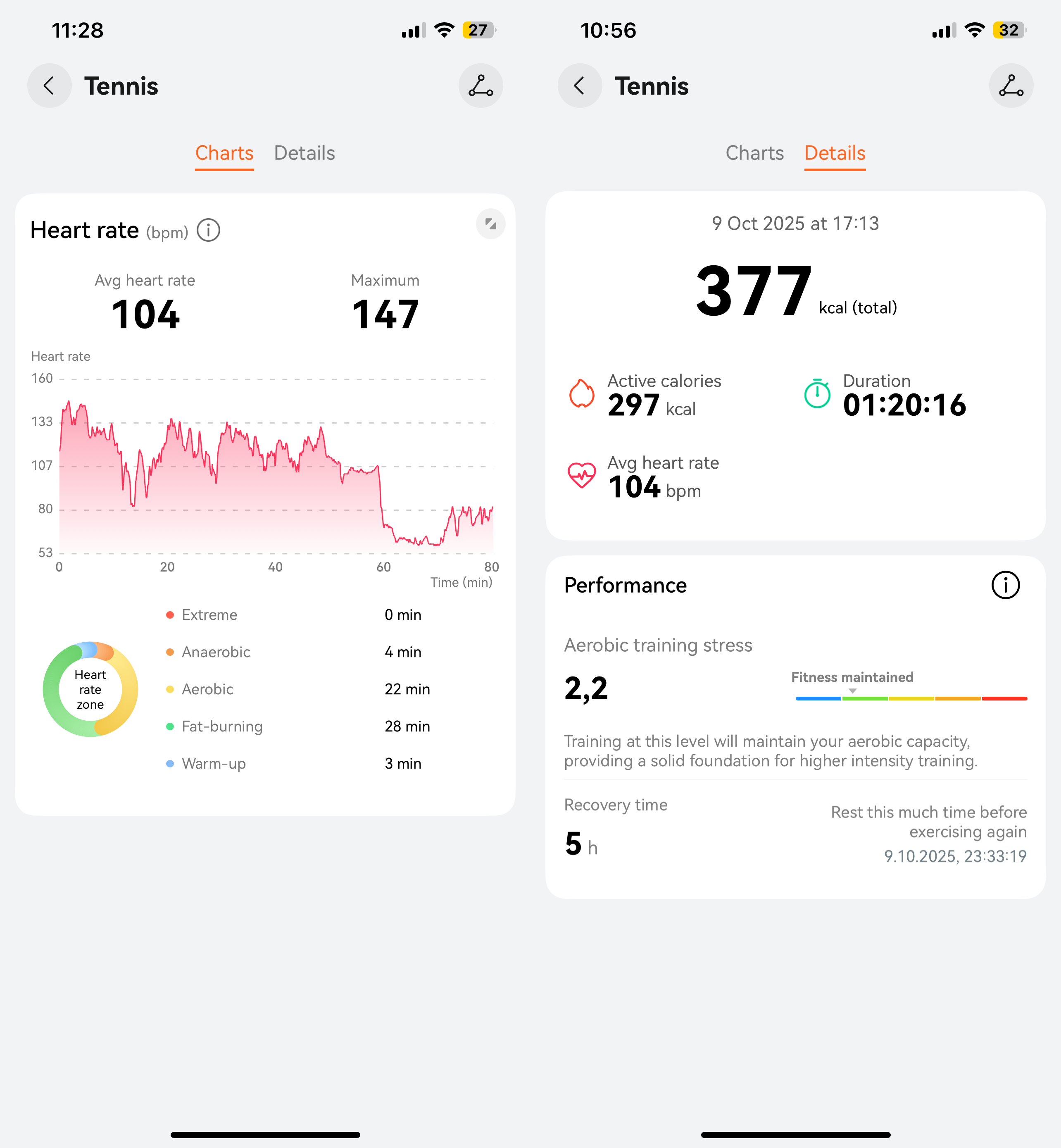 Например тренировка по тенис в рамките на 1 час и 20 минути ми беше оценена на 2.2 aerobic training и необходимо време за възстановяване 5 часа. Добро натоварване за поддържане на текущото нивото и добра основа за надграждане и по-интензивни тренировки. Докато скачането в трамплинен парк с децата ме изненада. Очаквах натоварването и качеството на тренировката да са значително по-добри, но явно съм правила по-дълги паузи за почивка. Оценката е 1.0 aerobic training stress. Съответно само 6 минути аеробно натоварване срещу 22 минути от тенис тренировката, fat-burning 10 минути срещу 28 от тенис…
