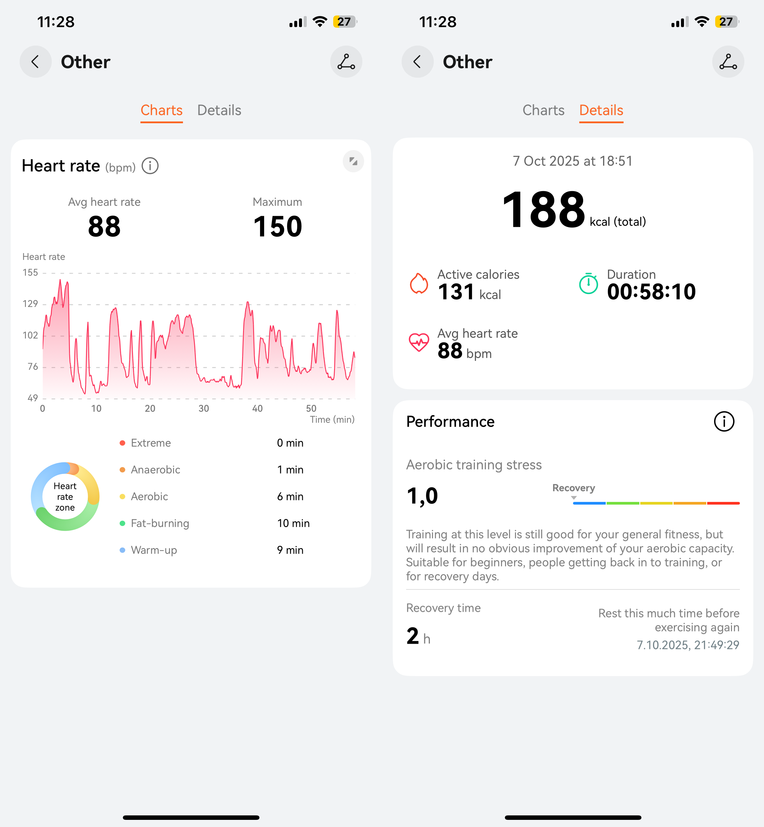 Информацията, която можеш да получим от приложението Huawei Health след всяка активност или тренировка, е много полезна за анализ на качеството и целите, които сте си поставили. Освен изразходените калории може да видите какъв тип е било натоварването в различните фази (aerobic, anareobic, warming, fat-burning, extreme, warm-up), какво е било качеството на самата тренировка и колко време е необходимо за възстановяване.