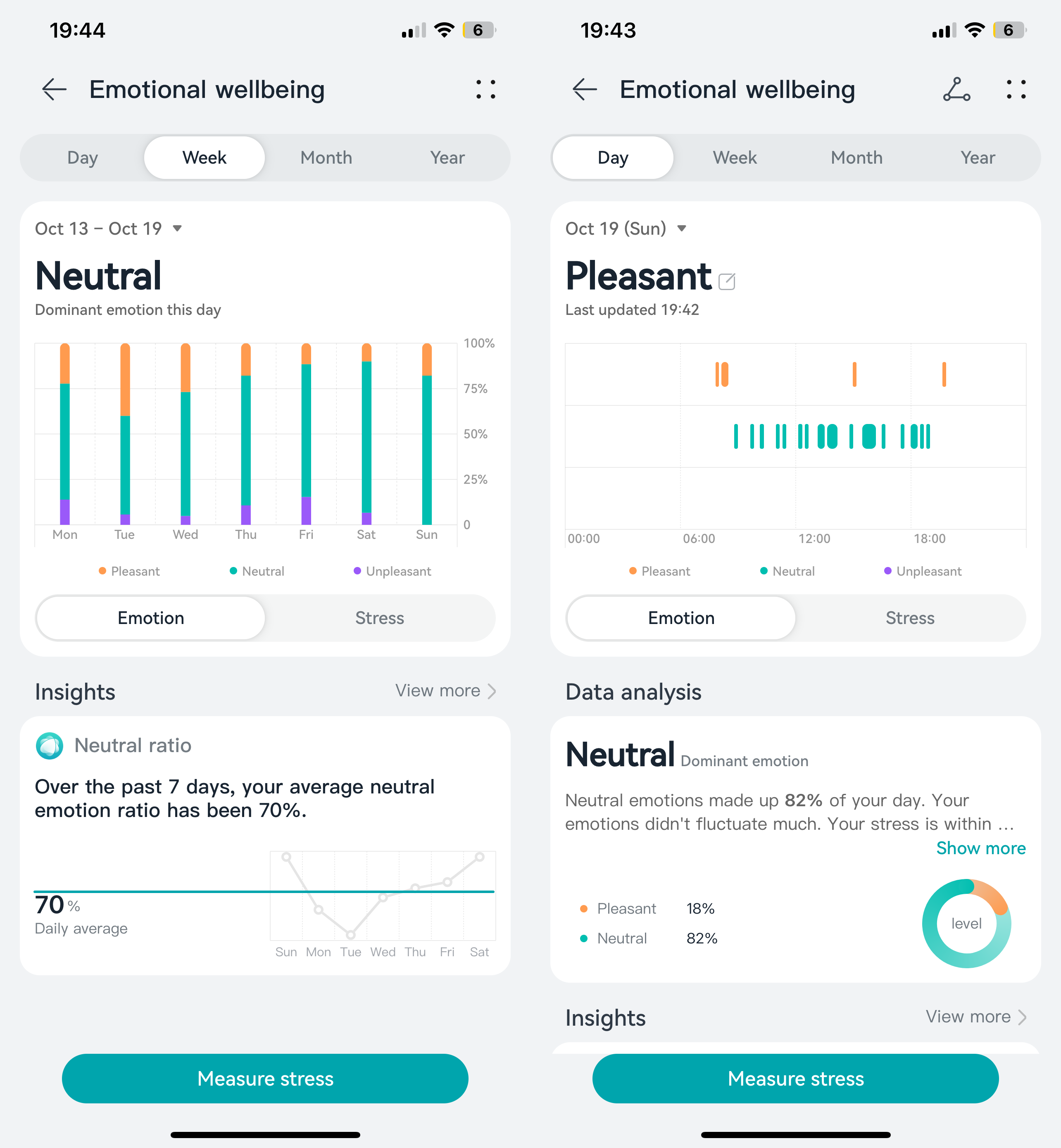 В последните модели на Huawei от серията GT6 и GT Pro 6 продължава надграждането на функцията well-being, която благодарение на True sense технологията измерва емоционалното състояние в 12 типа подкатегории, които се разпределят в 3 основни - pleasant, unpleasant, neutral. Можете по всяко време да проверите на телефона как са определени вашите емоции за последните 10 - 15 минути, но по-интересно е да се види цялата диаграма за деня и да се съпостави с другите активности, както и с качеството на съня. Дали спортът и по-добрият сън водят до по-добро емоционално състояние, или срещата с приятели и един вълнуващ концерт не допринасят повече за емоционалното благосъстояние?