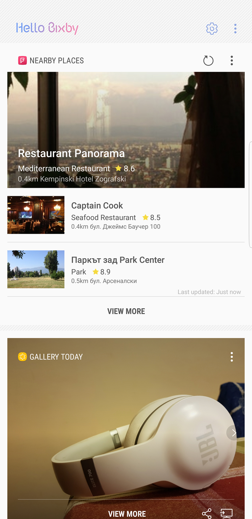 Самият Bixby се пуска с гласова команда, физическия бутон или през менюто, намиращо се вляво от началния екран. Последното събира информация от много приложения, от навиците ви на използване и дава бърз достъп до всичко това - Facebook, Twitter, поща, снимки, място, заведения в района, времето и т.н. Първите няколко слайда са наистина полезни, но към края можете да видите неща, които ще ви трябват по-рядко, като например нови теми.
